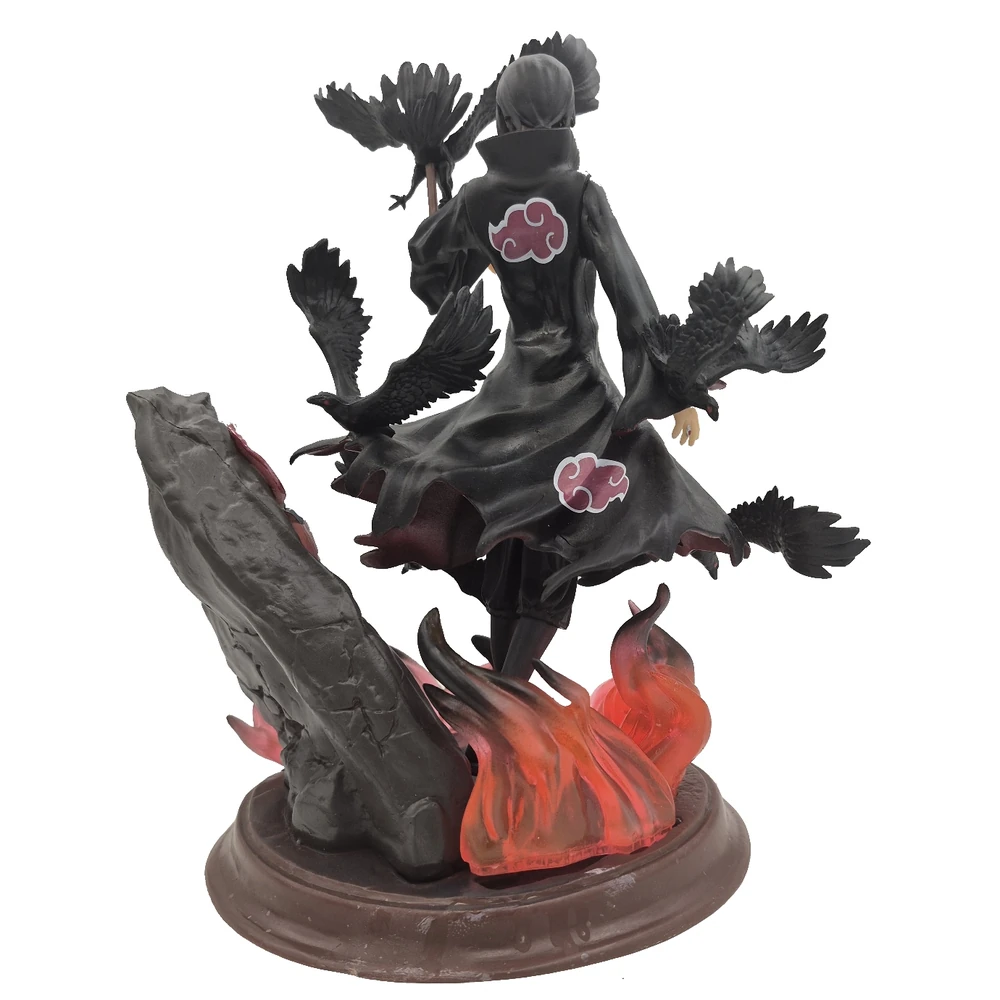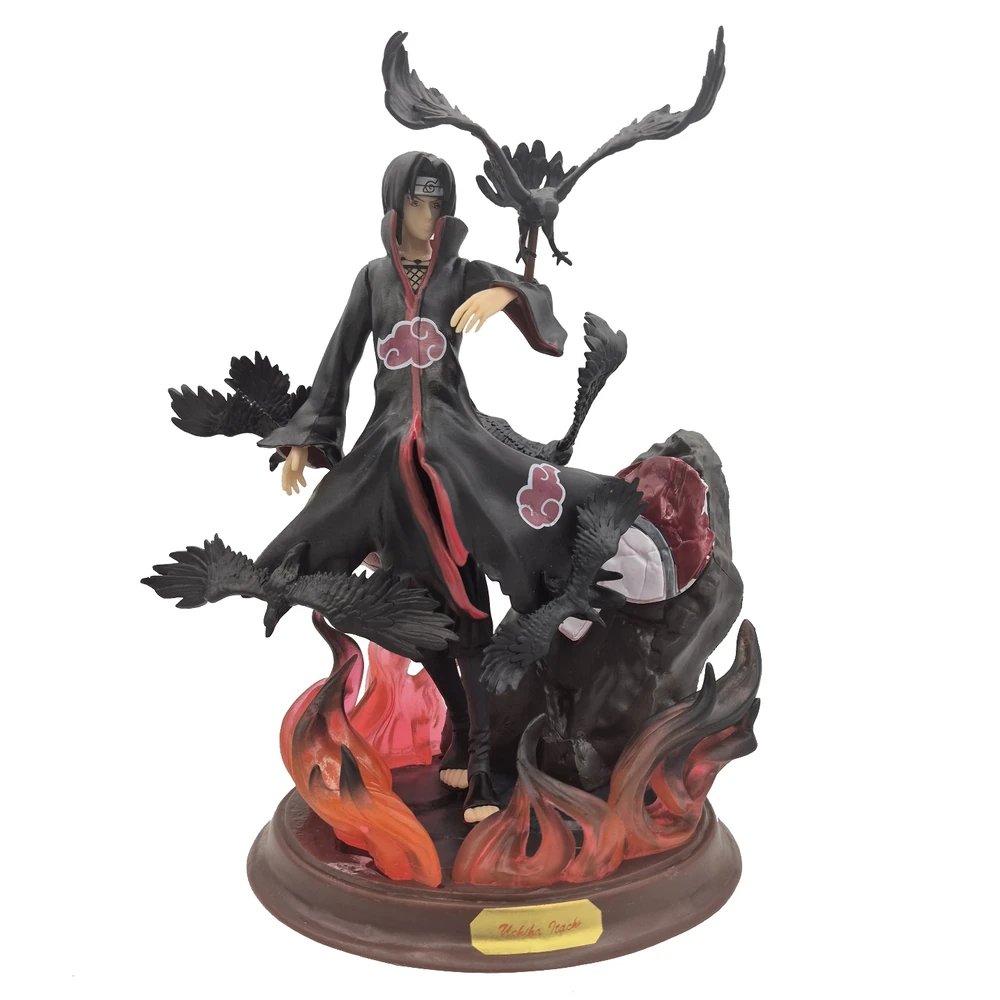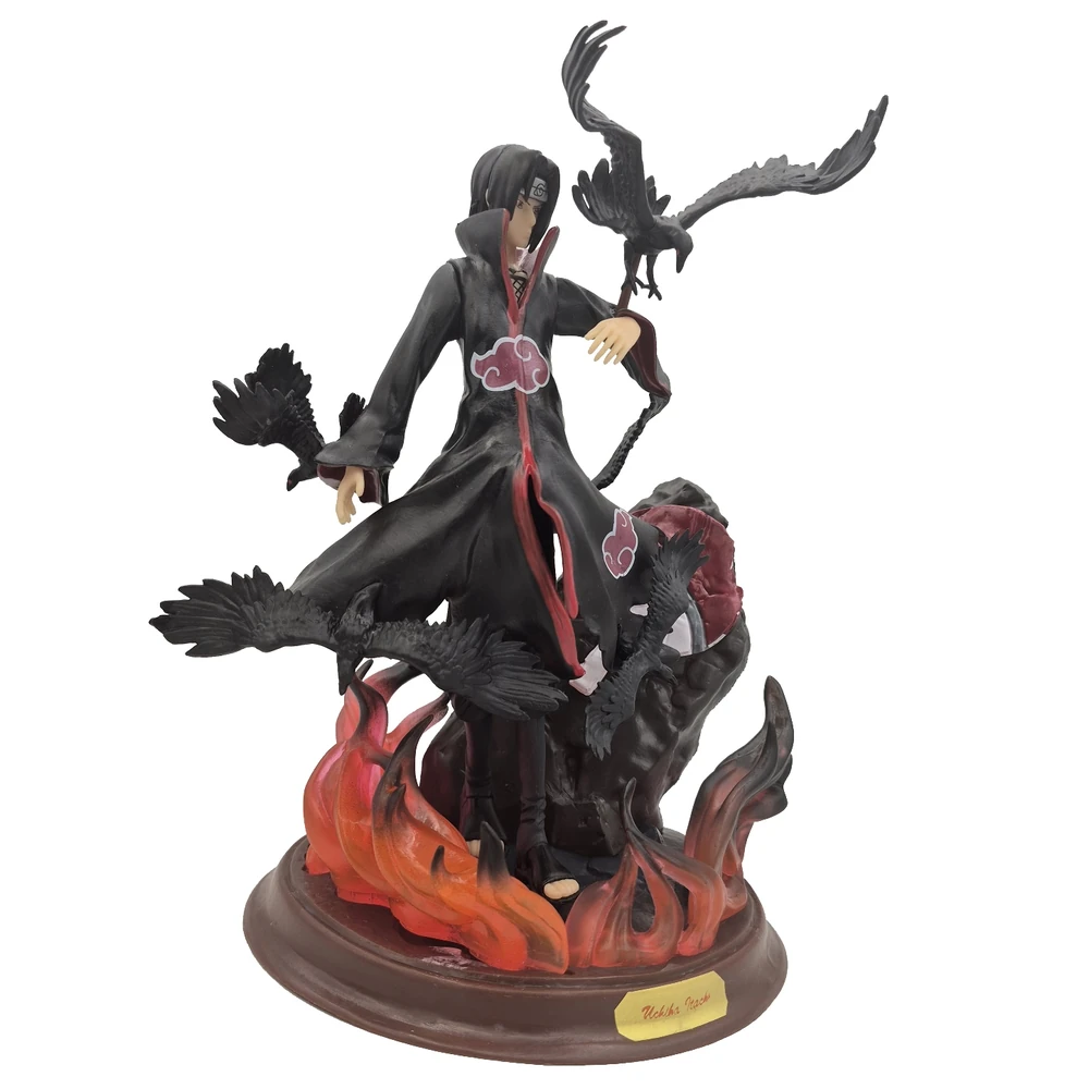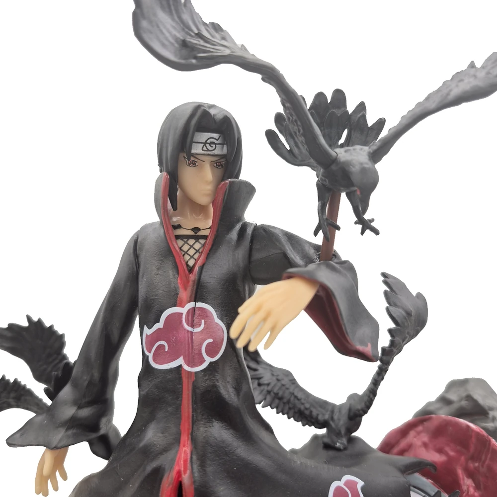 ایتاچی در مرکز، چند کلاغ ساده (اشکال سیلوئت) اطرافش در حال پرواز