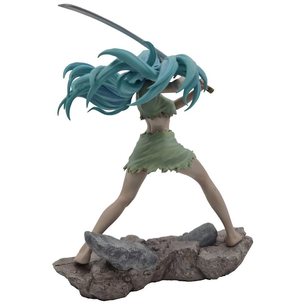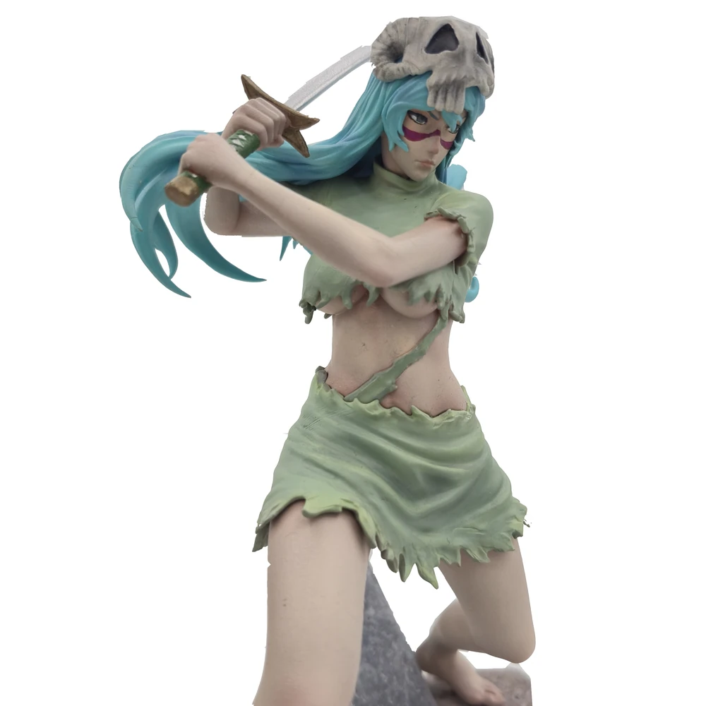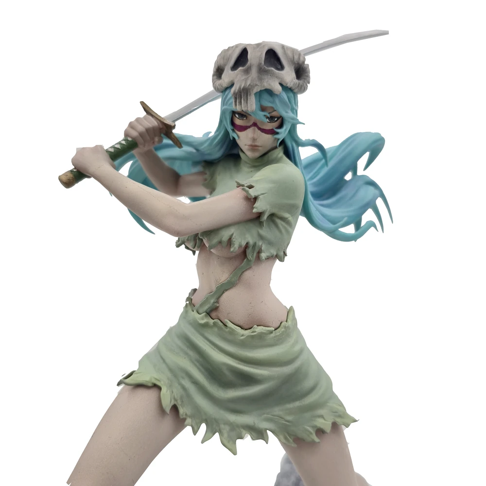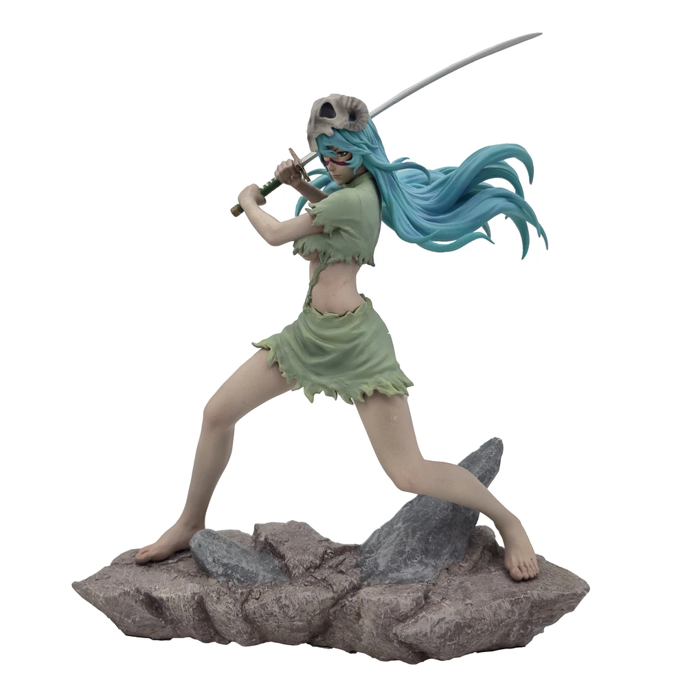 موی سبز-فیروزهای، تکهی ماسک استخوانی روی پیشانی/گونه، لباس سادهی سبز، شمشیر/نیزه (Spear)؛ حالت چهره مصمم اما مهربان.
